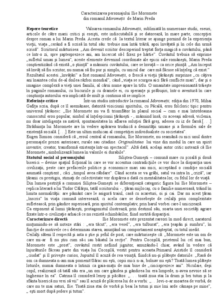 Doc Caracterizare Ilie Moromete Morometii De Marin Preda Elena Grigorescu Academia Edu
