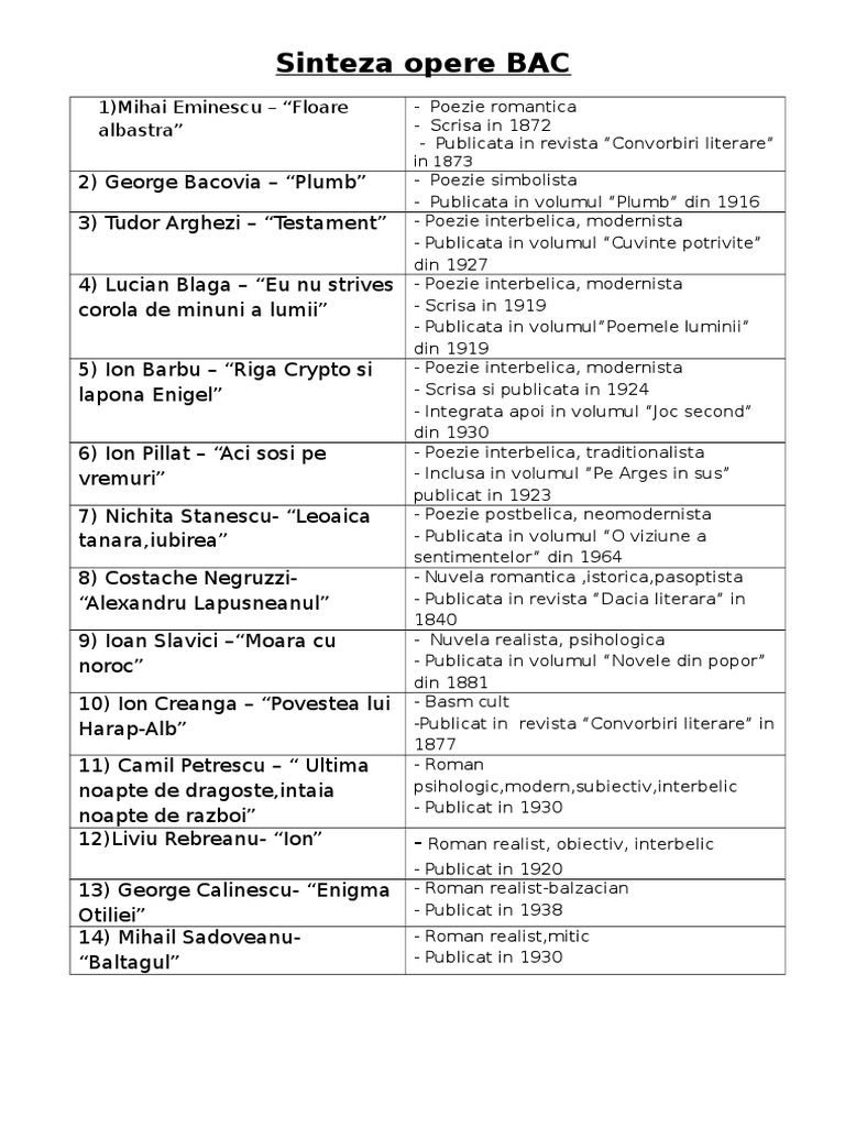 Limba Si Literatura Romana Opere Pentru Bacalaureat